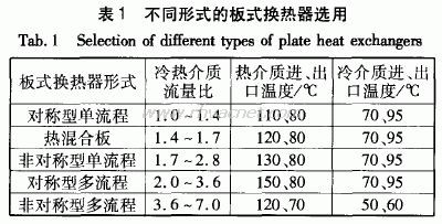 換熱器板間流道內(nèi)介質(zhì)平均流速以0.3~0.6m/s為宜,阻力以不大于100 kPa為宜。根據(jù)不同冷熱介質(zhì)流量比,可參照表1選用不同形式的板式換熱器,表中非對稱型板式換熱器流道截面積比為2。采用對稱型或非對稱型、單流程或多流程板式換熱器,均可設(shè)置換熱器旁通管,但應(yīng)經(jīng)詳細的熱力計算。